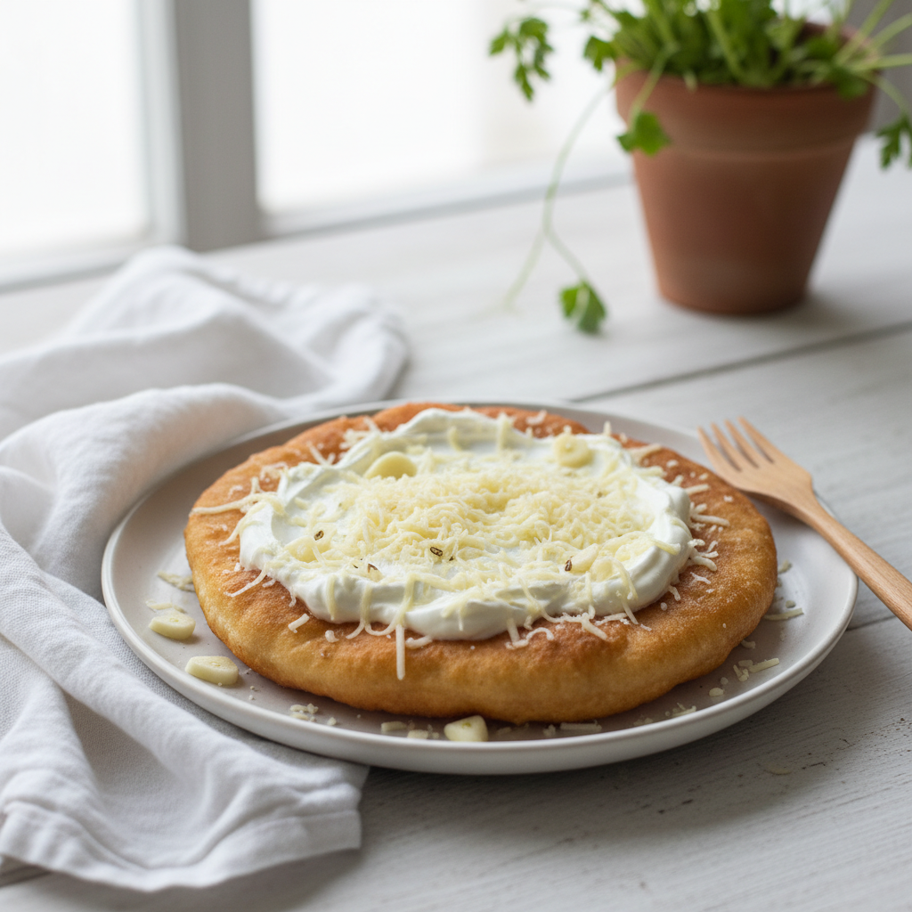 Crispy fried flatbread, the heart of Hungarian street food. Topped with sour cream, cheese, and garlic, its pure comfort.