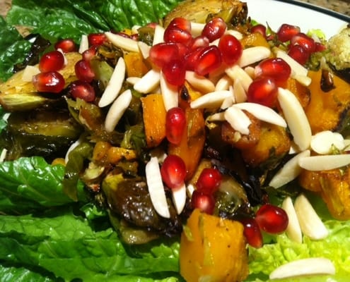By combining the earthiness of broccoli, cauliflower, butternut squash and Brussels sprouts with the tanginess of pomegranate seeds and balsamic, this dish incorporates the right ingredients at the right time and packs a surprising flavor. This sassy salad serves two as a main dish but can also serve four as a side dish.