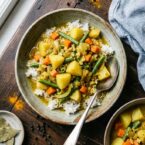Loaded with a flavorful array of spices and served over jasmine rice, these Indian curry potatoes with spring vegetables are bright and hearty. The perfect dish for a cool day.