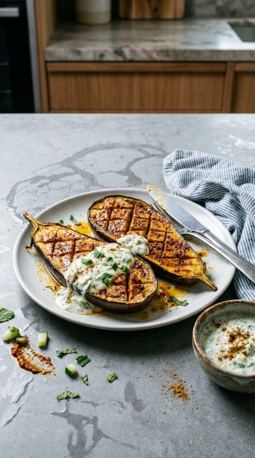 And to top it off, we’re serving it with a cucumber mint raita. It’s really easy to make—just yogurt, cucumber, and fresh mint—and it’s the perfect cooling sidekick to the spiced eggplant. This dish is great as a side, but honestly, it’s so good it could totally steal the show as a light main course. Serve it up with some naan or basmati rice, and you’ve got yourself a meal that’s as tasty as it is easy to put together.