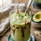 - In the serving glasses, pour chocolate syrup on the side of the glass and let it drip down. Then pour in the avocado blend.