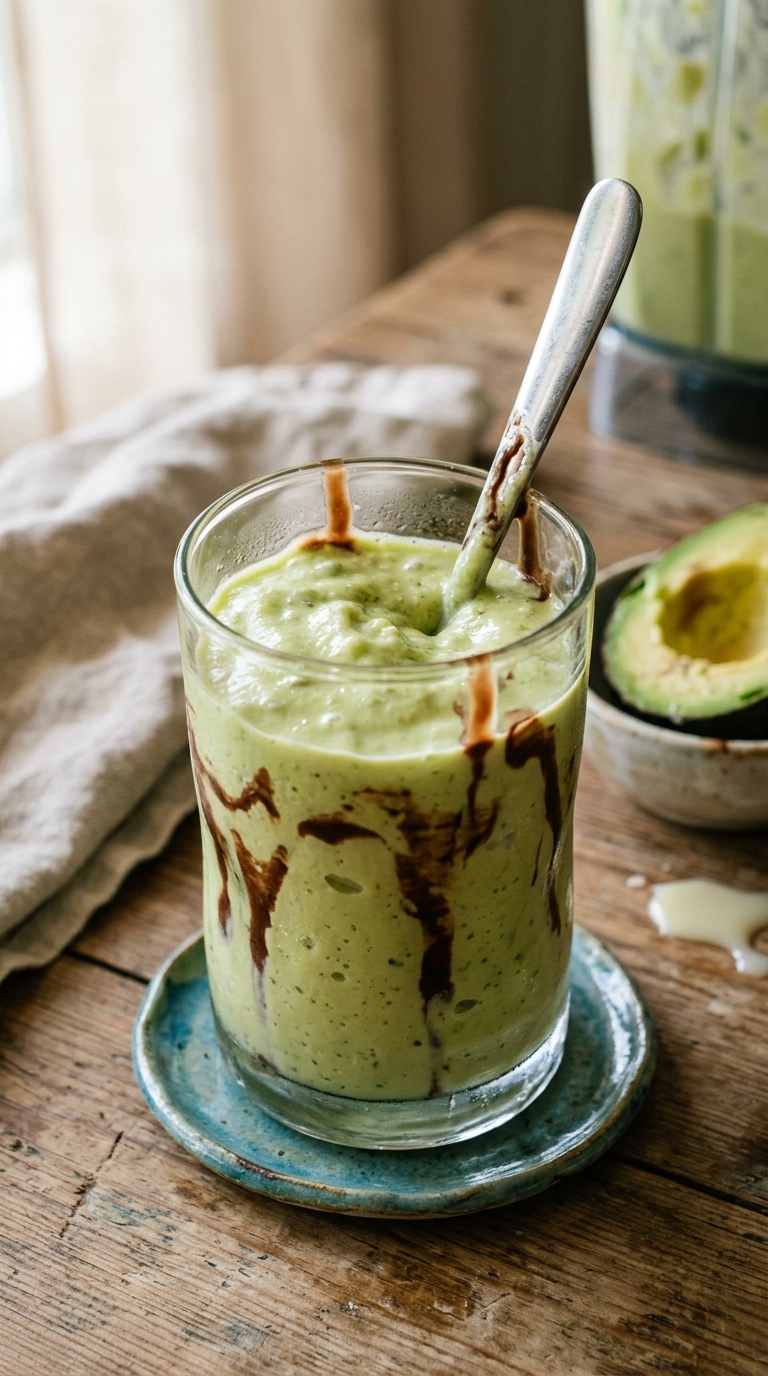 Pour the avocado blend first, then tilt the glass and slowly drizzle chocolate syrup down the inside wall. Alternatively, drizzle the syrup inside the empty glass before pouring the shake in — gravity pulls it down as the shake fills the glass, which is the Balinese café method.