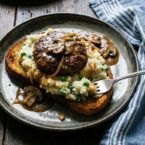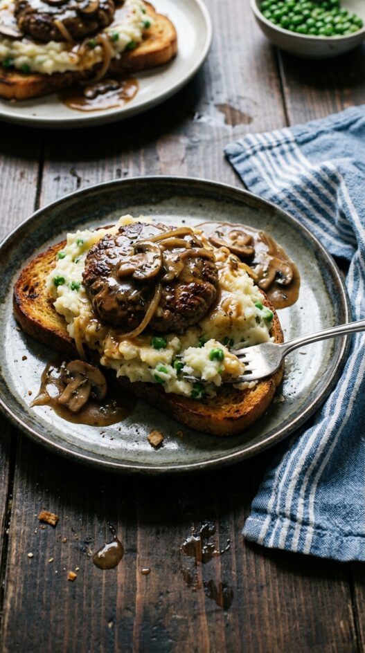 A creative twist on a comfort food classic, this recipe serves savory beef patties and rich mushroom gravy over creamy pea-studded mashed potatoes and crisp garlic toast.