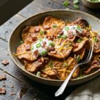 Crispy sweet potato chips piled high with savory bacon, creamy sour cream, and sharp cheddar. The perfect easy weeknight dinner.
