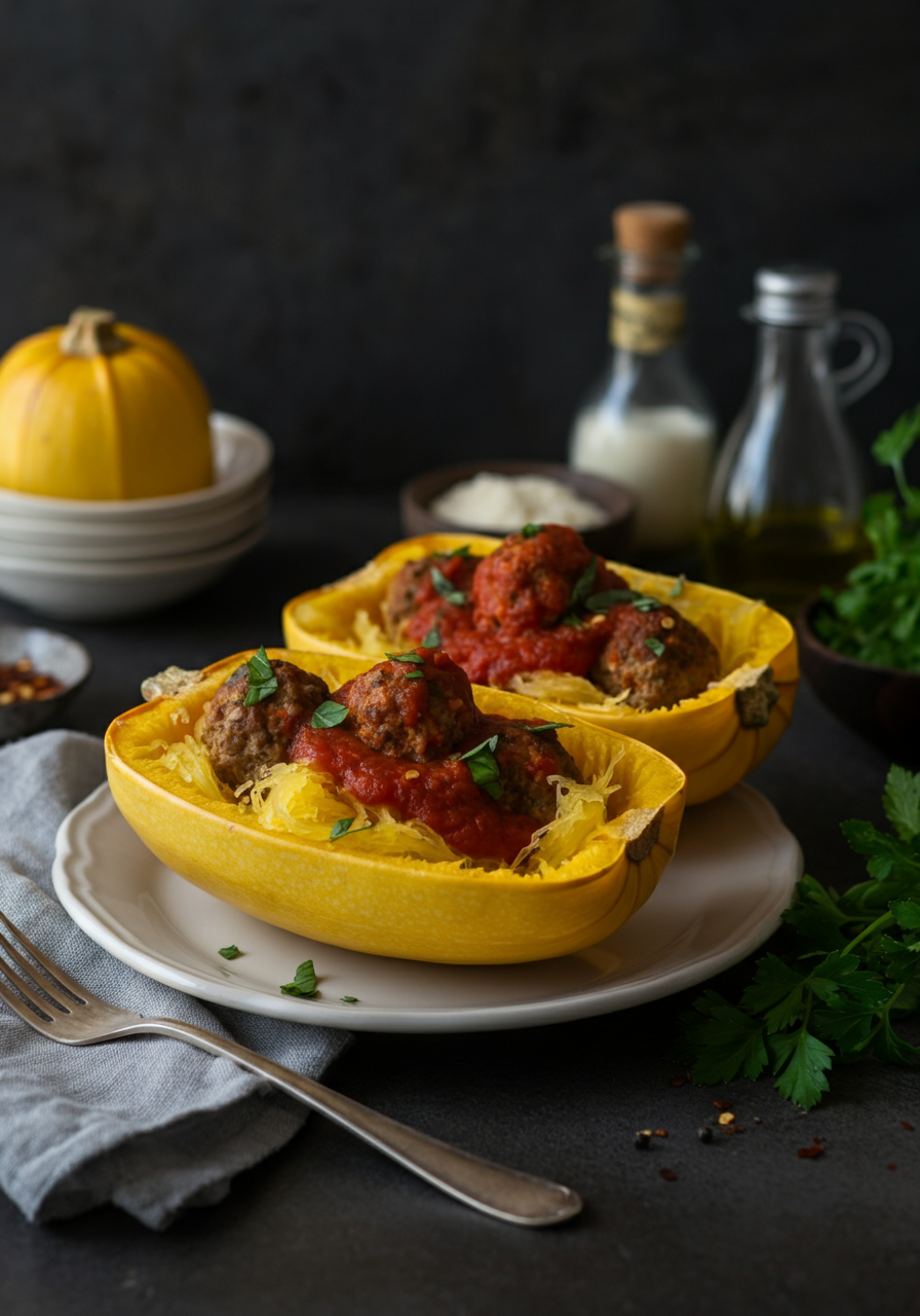 Hearty Italian meatballs nestled in tender spaghetti squash. A comforting, flavorful weeknight meal.