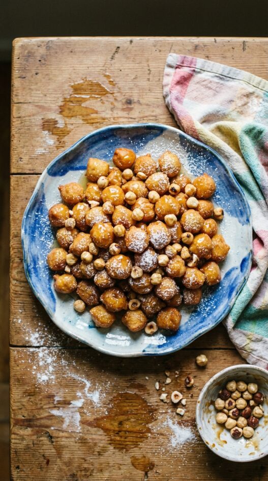 Crispy fried dough balls, tossed in honey syrup and hazelnuts—a classic Italian Christmas treat.