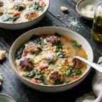 Dive into a hearty bowl of warm Italian wedding soup loaded with filling pork meatballs. The perfect dinner to warm you to the bone.