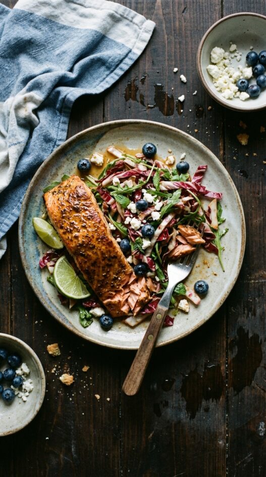 Create a homemade jerk blend and toss it on your salmon for a show-stopping, flavorful meal served over a bed of blueberry, radicchio, arugula and more.