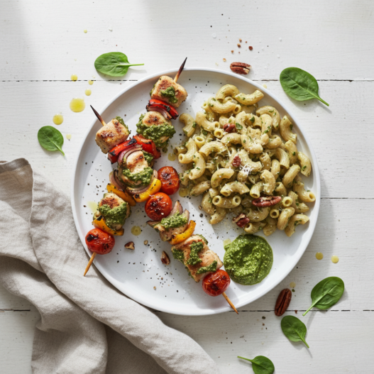Juicy chicken kebabs marinated in a vibrant spinach pecan pesto. Perfect for a summer BBQ!