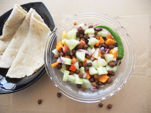 Black chickpea salad is an easy low calorie, oil free vegan salad. This is a super simple and easy salad with a tinge of spice. If you are on a diet this salad can be had with roti / Indian flat bread. You can also find this being sold in front of the famous Mysore Palace, railway stations etc. If you have cooked chickpeas, all it takes is to chop the vegetables and mix in.