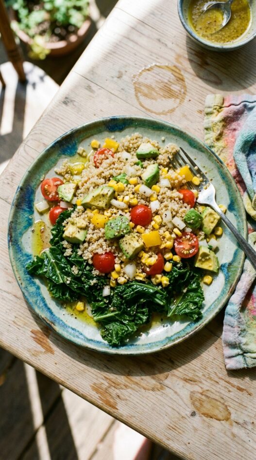 Quinoa and kale can feel like a wellness-blog cliché until you actually make a bowl that tastes like something you’d want to eat again. This one hits that mark. Steamed kale, cooled quinoa, sweet corn, creamy avocado, and a sharp Dijon-lemon dressing that ties it all together. it’s a salad that genuinely satisfies rather than just making you feel virtuous. Bright, filling, and sturdy enough to pack for lunch without wilting by noon.