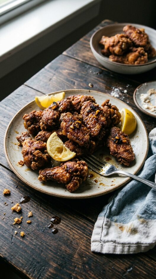 Serve the Karaage with wedges of lemon for a fresh balance and optionally, a small bowl of Japanese mayonnaise and Shichimi Togarashi for added flavor.