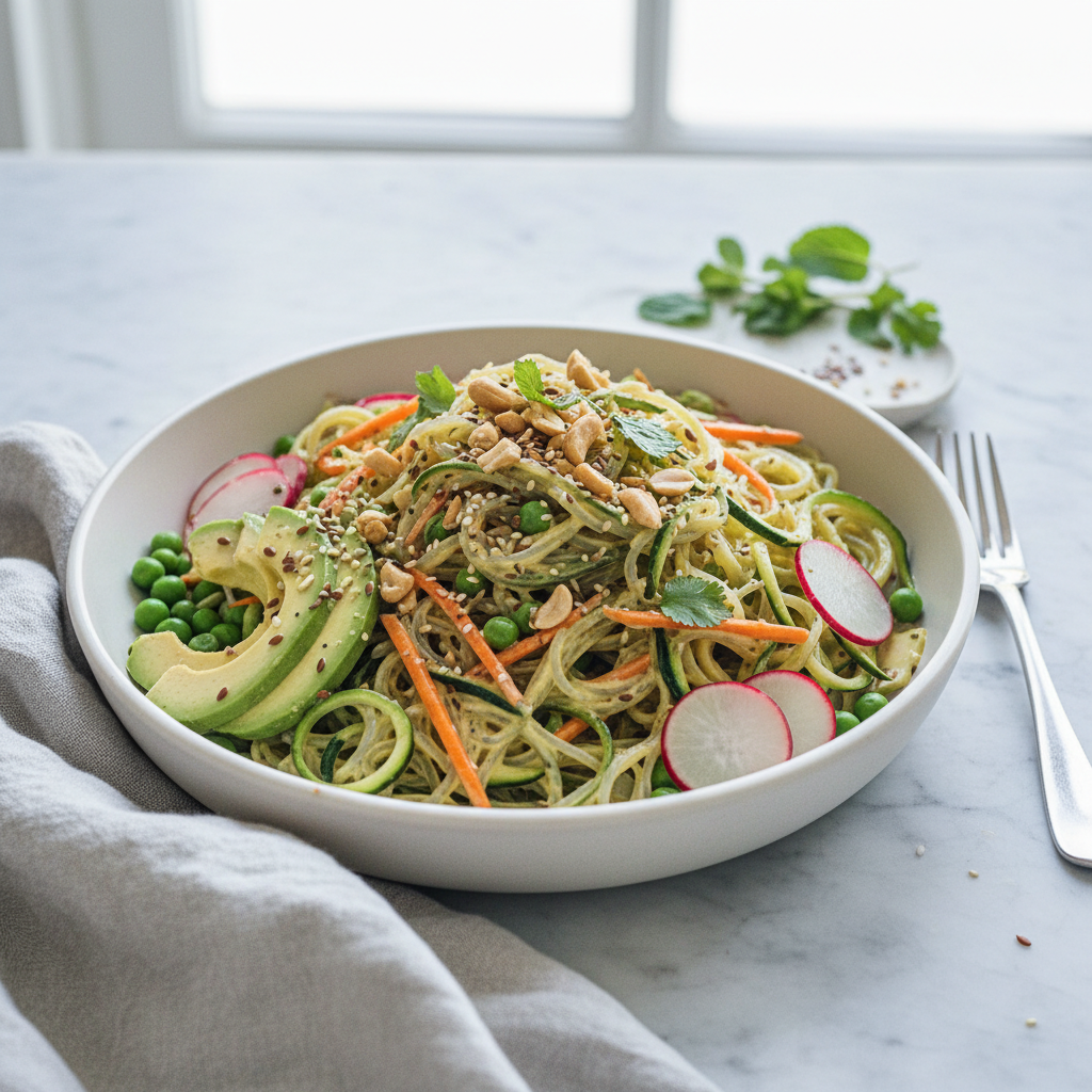 You can prep the vegetables and dressing separately up to a day ahead. Toss everything together just before serving so the kelp noodles stay firm and the vegetables stay crisp.