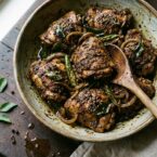This pepper chicken, or kurumulaku chicken, is an easy and quick Kerala-style dry roast chicken dish. It is traditionally served spicy, but you can definitely adjust the spice level to suit your taste. You can use both bone-in or boneless chicken for this dish, but my personal preference is bone-in thighs.
