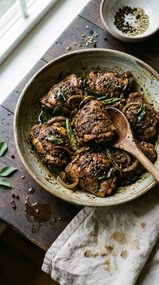- Add Curry Leaves: Sprinkle the curry leaves over the chicken and give it a final stir.