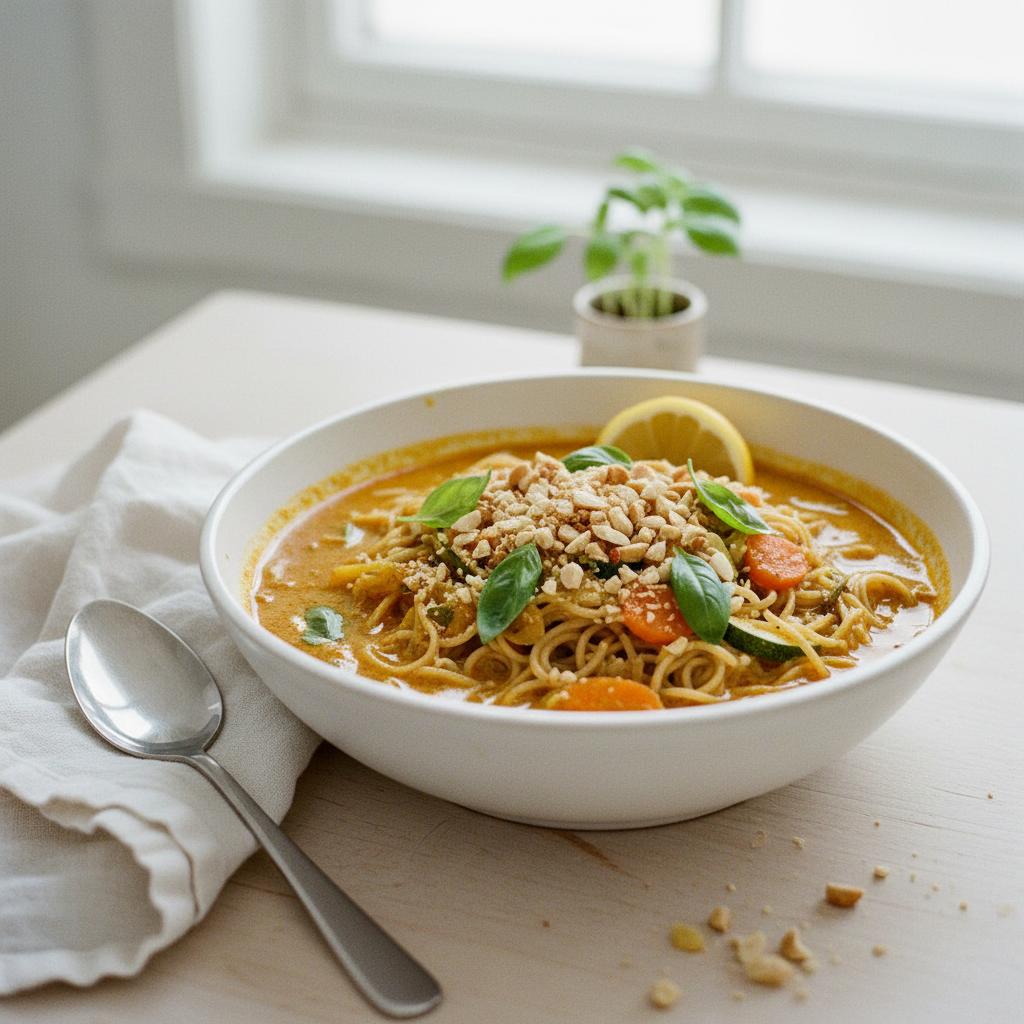 A vibrant vegan curry, bursting with vegetables and coconut milk. Served over soba noodles for a satisfying and healthy meal.