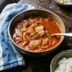 This dish is a way of employing sour, overripe kimchi; kimchi that is too fresh won’t lend the same depth to the broth as kimchi that has been given more time to mature. You could definitely make jjiggae without the pork belly, but with it, the layer of fat tenderizes to silk as the soup bubbles away, melting into and bulking up the broth without making it oily. Print