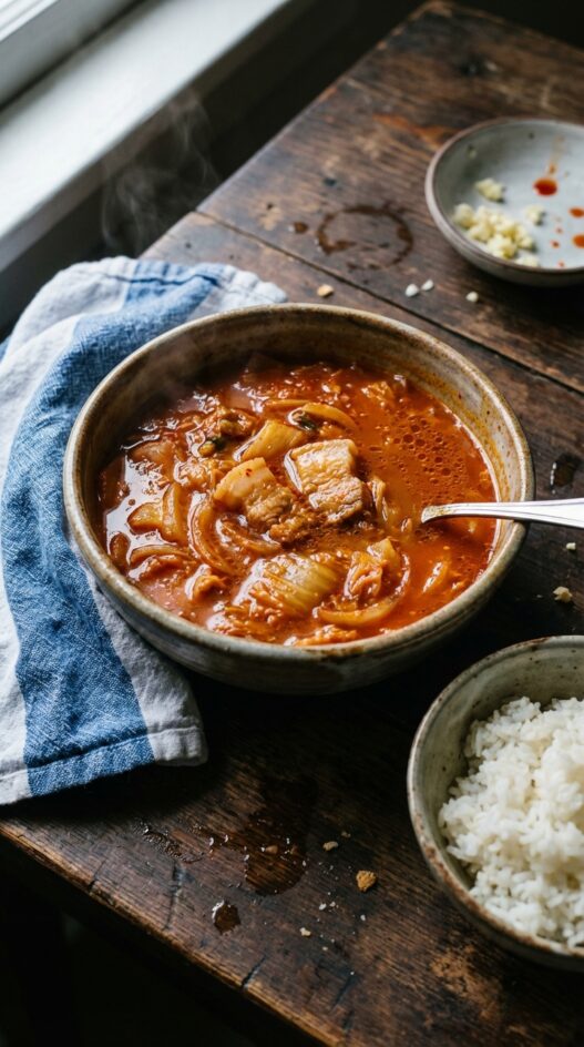 - Continue boiling for thirty minutes until pork and kimchi are tender and broth becomes rich and creamy.