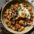 This comes together in less than ten minutes if you have leftover rice ready. The key is high heat and quick cooking so the rice gets a little crispy at the edges without turning mushy. Day-old rice works best because it’s drier and won’t clump. Use as much or as little pork as you want. Some people like mostly rice with bits of meat scattered through, others want pork in every bite. Both work.