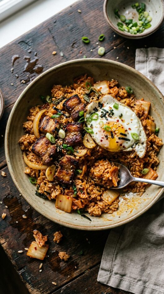 Fried rice with kimchi, pork belly, and gochujang, topped with a sunny-side-up egg. The pork gets seared until the edges crisp, then absorbs flavor from the kimchi and its juice before the rice goes in.