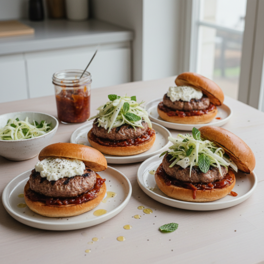 Lamb Burgers with Bacon Tomato Jam, Fennel Slaw and Goat Cheese