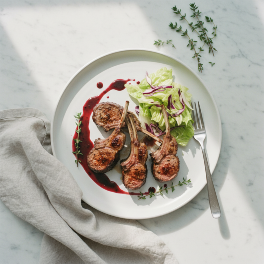 A friend of mine spent a summer in Iceland and came back talking about the lamb constantly. Small farms, short growing season, grass-fed animals that wandered wherever they liked. I’ve never been, but I’ve been chasing that flavor for years through sourcing and technique. This recipe gets close. The blueberry-balsamic reduction sounds fancier than it is: shallots, balsamic, blueberry juice, a sprig of thyme, reduced down until syrupy. It takes about fifteen minutes. The lamb does most of the heavy lifting with a garlic-thyme marinade and a hard sear on all four sides. Rest the chops before plating or you lose the juices you worked for.