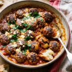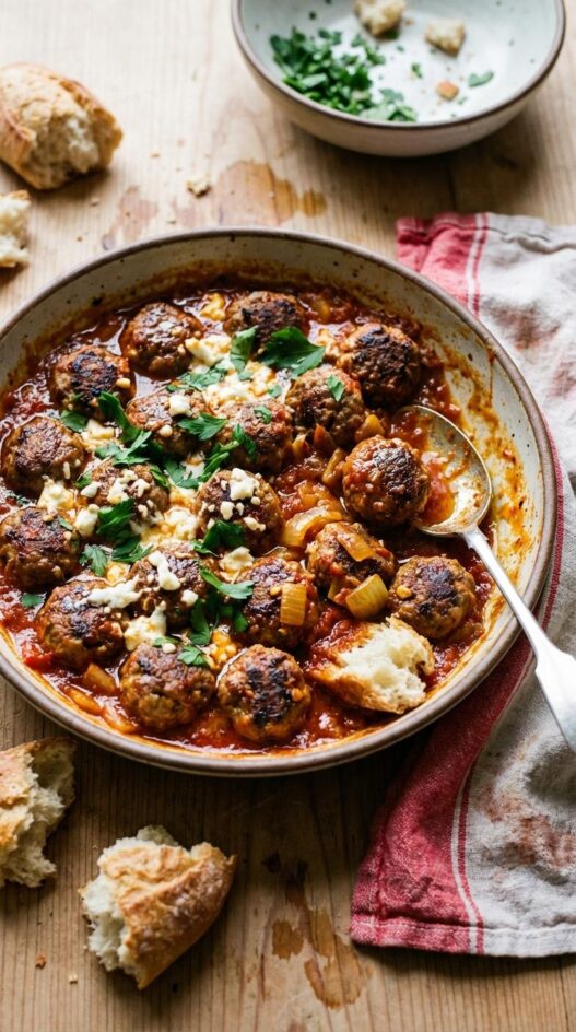 That rendered fat is carrying all the flavor from the spices, and it enriches the tomato sauce as the meatballs simmer. Reliable. The harissa paste gives the sauce a smoky, slow-building heat that works against the cooling feta on top. Simple as that. Fresh mint is PERFECT here. It cuts against the richness of the lamb and keeps every bite from feeling heavy. Serve this with warm pita or flatbread, or over couscous if you want something more substantial. These also hold up well as leftovers, and the sauce only gets better as the flavors develop overnight.