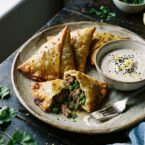 Enjoy the samosas hot with the sumac and zaatar dip on the side.