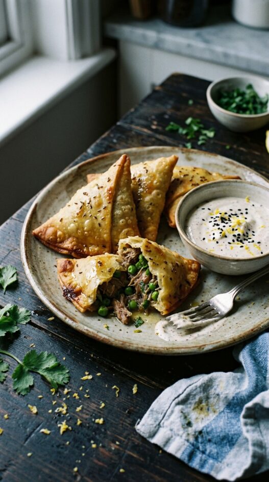 - Cook the Filling: In a separate pot, heat sunflower oil over medium heat. Add ginger and garlic, sautéing until golden. Stir in the remaining spices and green peas, cooking for 1 minute before adding the shredded lamb. Pour in the reserved lamb stock, adjust salt to taste, and simmer for 10-15 minutes. Add chopped coriander, then remove from heat to cool.