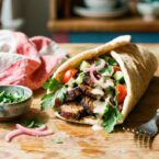 Warm the flatbread, load it with the sliced lamb, pickled turnips or red onion, fresh vegetables, and a drizzle of tahini or garlic sauce. The wraps take about 90 minutes total, but most of that is marinating time, the actual cooking is fast.