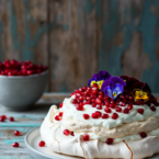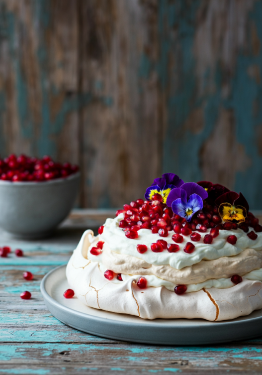 A stunning meringue dessert with layers of creamy vanilla filling and tart pomegranate seeds. Perfect for celebrations!