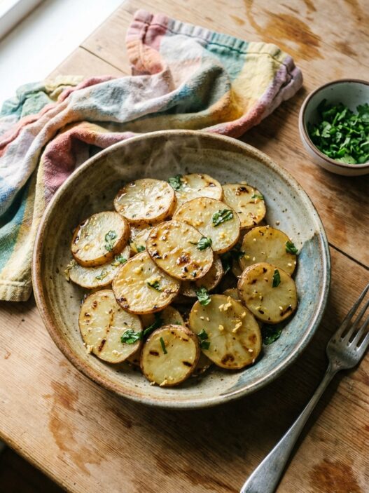 - Add the potato slices to a large pan of boiling water and cook for 2 minutes; drain and lay out onto a towel to dry.