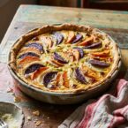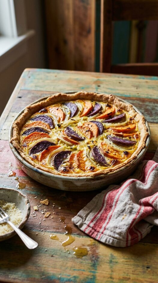 This layered potato quiche is a colorful and delicious meal in itself. Sweet and purple potatoes are layered in with eggs, leeks, fennel and seasonings that are poured over a buttery, flaky crust and the top is adorned with an eye-catching potato display.