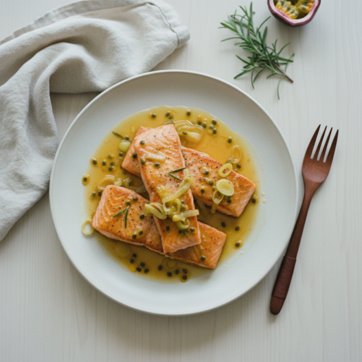 Served with a bold passion fruit and leek sauce, this grilled salmon recipe is loaded with bright flavors that will leave you feeling full, but not weighed down.