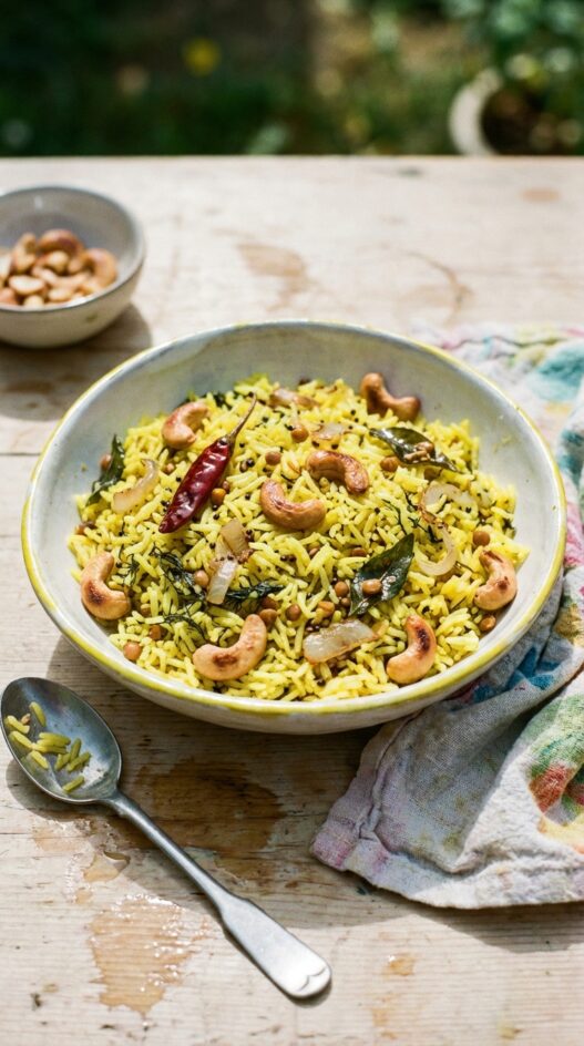 - Add the yellow rice and salt to taste; mix well. Mix in the cashews (save some for garnish). Squeeze lemon juice on top and mix. Garnish with the remaining cashews.