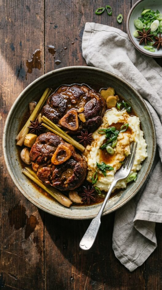 Hearty bison shanks braised to tender perfection in a rich Asian-inspired sauce. A comforting, flavorful twist on a classic!