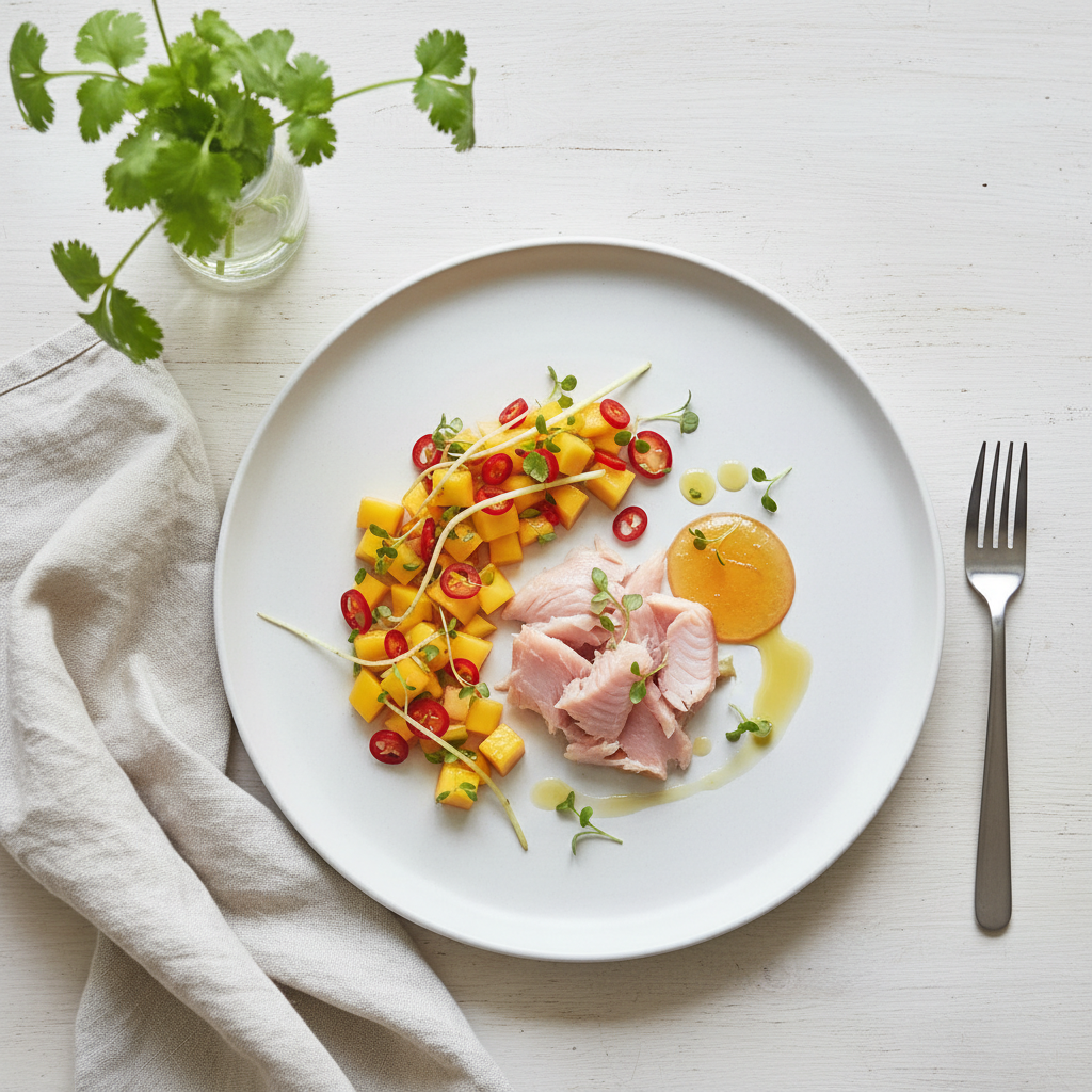 This vibrant dish features delicately smoked trout, complemented by a bright and zesty mango salsa. A perfect light meal for a warm evening.