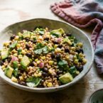 Use fresh corn on the cob for the best flavor; grill it until itās slightly charred, then cut the kernels off the cob before adding them to the salad.