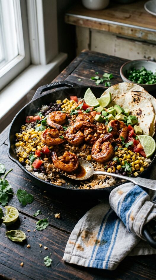 If I’m indulging in a night of tequila drinks, I love nothing more than to order up a spicy dish to go along side – enter this chipotle lime shrimp skillet.
