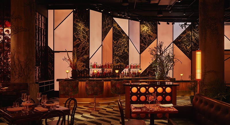 Inside, two-tone ceramic floors, sculptural chandeliers, and a glowing bar backsplash set the mood for conversation. The main dining area opens into several private rooms, each with its own design personality. Altogether, the space is packed with Quality Branded’s signature flair for striking design and a vibrant, social energy. We’re not complaining.