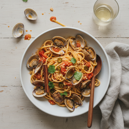 - Gently add the clams, garnish with cilantro or parsley, and serve.