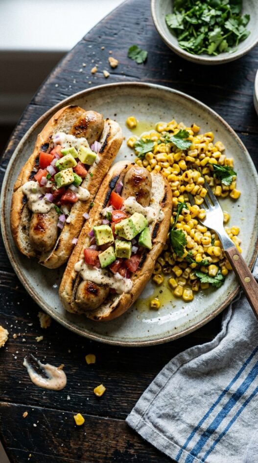 Add a twist to your All-American hot dog with a spiced mayonnaise sauce, fresh avocado, a corn salad, and a side of Chilean wine.