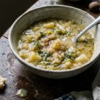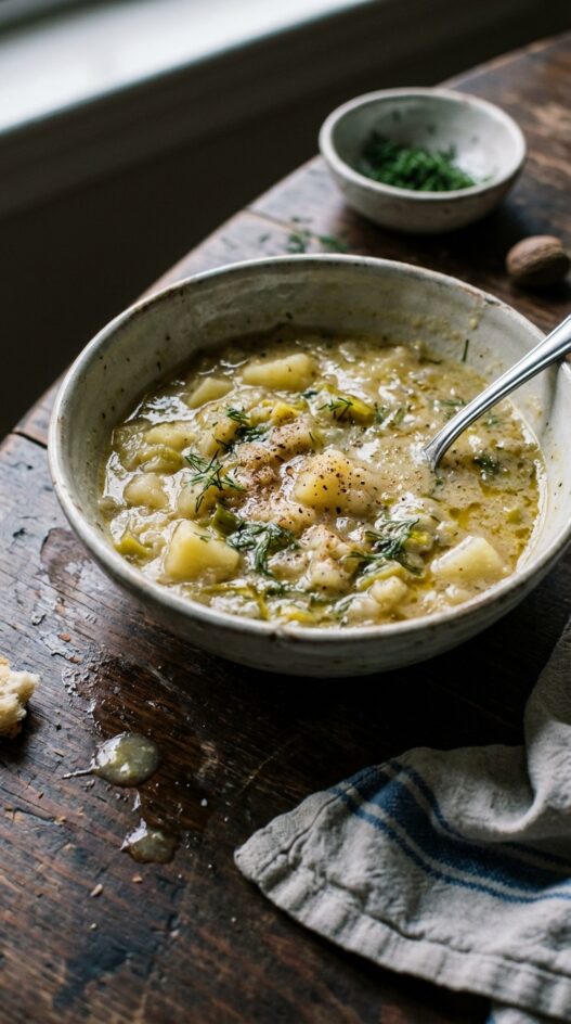 Fresh dill compliments the creamy potatoes. A splash of wine and a pinch of nutmeg give the soup additional layers of flavor.
