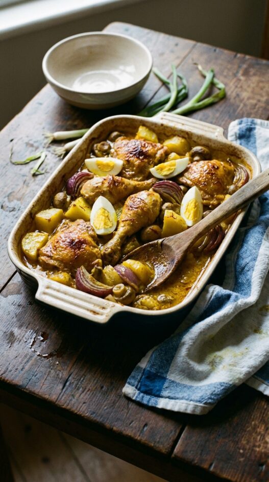 Transfer the mixture to a baking dish. Arrange chicken on top, then tuck in mushrooms and quartered eggs. Drizzle with the remaining coconut milk.