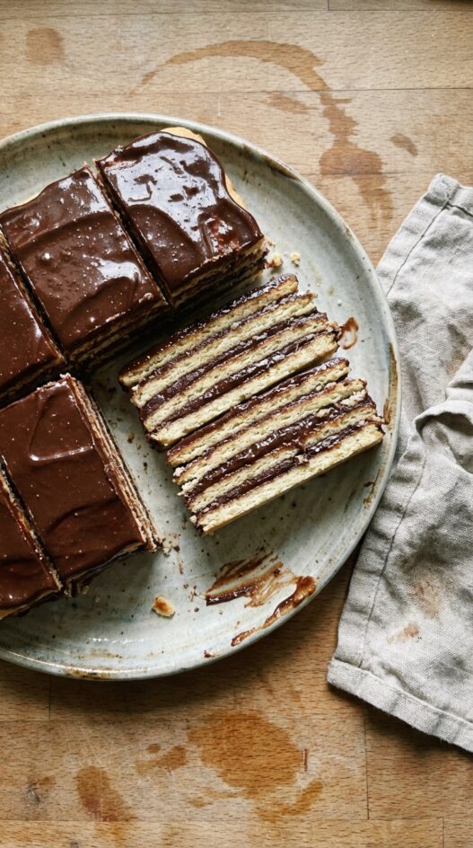 A Croatian layer cake with thin pastry sheets, chocolate custard filling, and a dark chocolate glaze. Madjarica takes time, but the result is worth the afternoon.