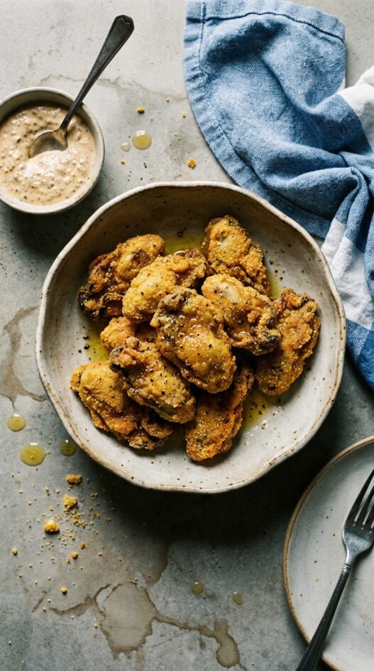 Crispy, golden-fried oysters, perfect for a party or a special occasion. Served with a creamy remoulade for dipping.