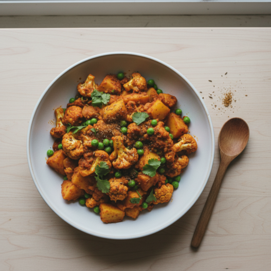 A simple, flavorful Indian-inspired dish. Cauliflower and potatoes simmered in aromatic spices.