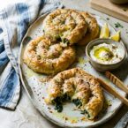 Savory round cheese borek are filled with wilted greens, sautéed shallots and cheese all rolled up in a delicious savory pastry.