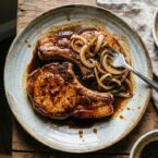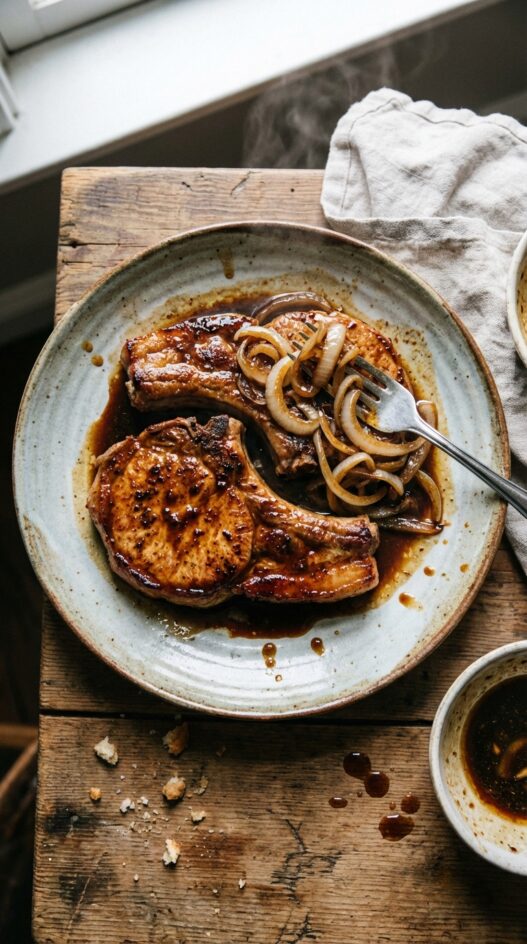 Pan-fried pork chops get a quick marinade and are served with tender caramelized onions. A simple, satisfying weeknight meal.