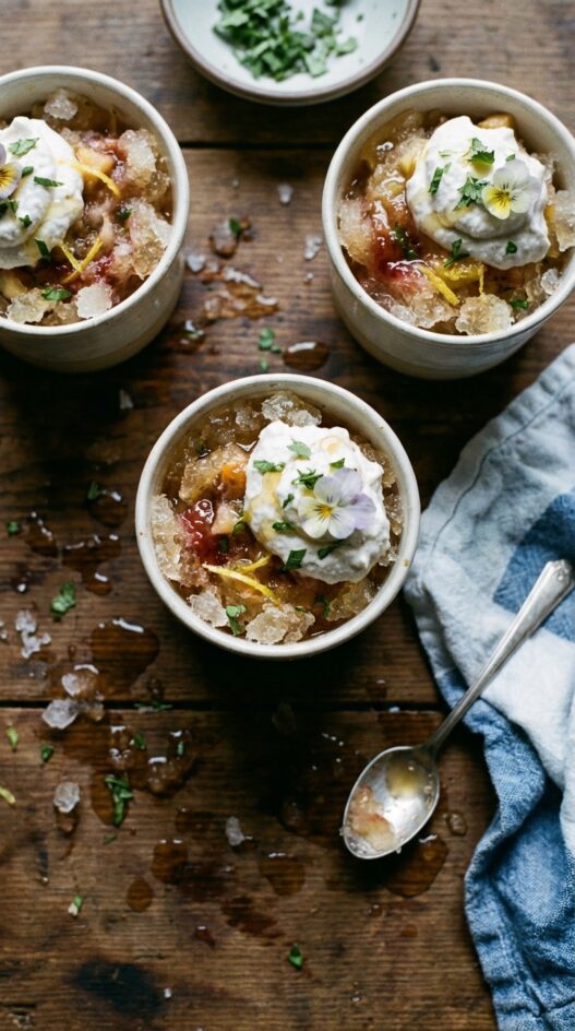 - Scoop the granita into glasses, top with whipped coconut cream, and serve with desired toppings.
